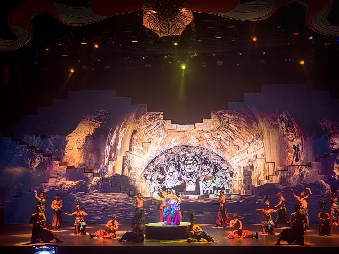 前沿的光影技术是此次演出的另一大亮点。舞台上,石窟壁画中的飞天伎乐、苏巴什佛寺遗址的古老传说通过动态投影立体重现,仿佛穿越时空,让尘封的历史“活”了过来。