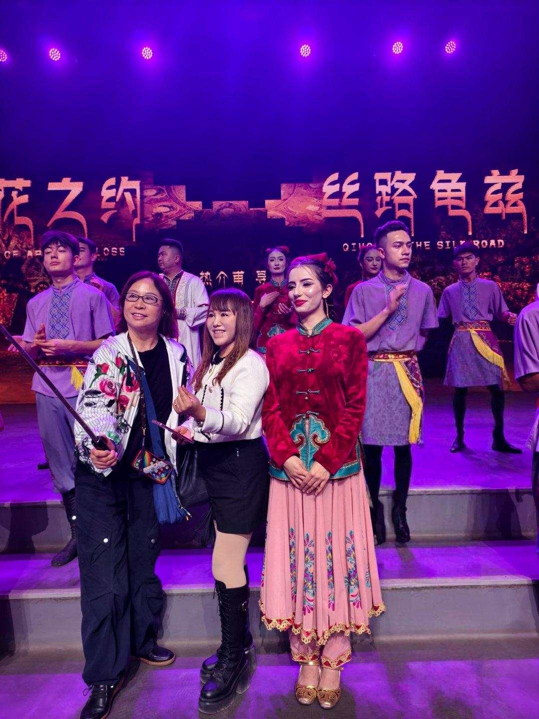 演出尾声,随着欢快的库车赛乃姆旋律再次响起,演员们热情邀请现场媒体代表走上舞台,与演员们共舞并合影留念。