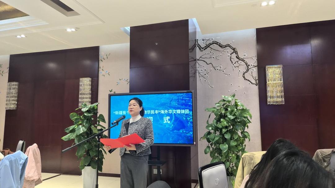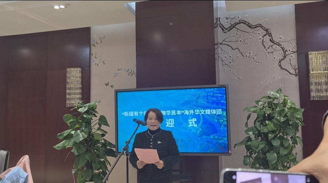 活动议程在庄重而热烈的氛围中有序进行。首先,阿克苏地区库车市委常委、宣传部部长王春梅代表当地政府致辞。她在发言中对远道而来的海外华文媒体朋友表示热烈欢迎,并简要介绍了阿克苏地区,特别是库车市深厚的历史文化底蕴、丰富的物产资源以及近年来在经济、社会、文化等领域取得的显著发展成就。并指出,阿克苏作为古丝绸之路重要节点,既是龟兹文化的发祥地,更是新时代新疆高质量发展的生动缩影。这里既有克孜尔石窟、柯柯牙生态工程等历史与自然交织的奇迹,也有长绒棉、糖心苹果等享誉中外的特色产业。而库车市作为“国家历史文化名城”与“中国百强县”,更是集中展现阿克苏深厚文化底蕴与蓬勃发展活力的核心窗口。